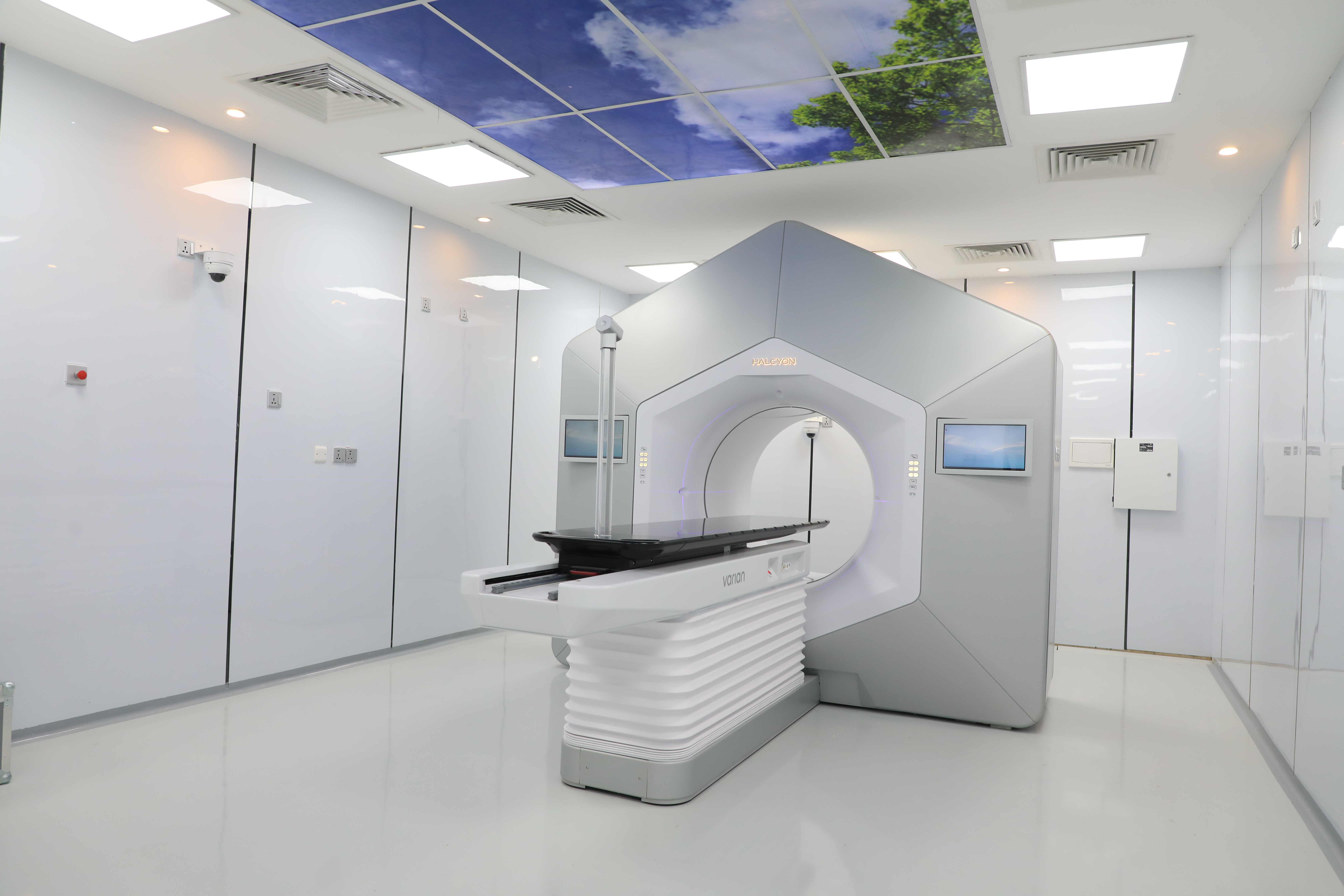 تم تجهيز المركز بجهاز المسرع الخطي هالسيون الأحدث إصدارا التابع لشركة فاريان الأمريكية للأجهزة الطبية. اختيار هذه النوعية من الجهاز و الشركة المصنعة تم عن طريق استشاريين و أصحاب الأختصاص في المجال الذين وضعوا عند اختيارهم لهذا الجهاز عوامل الجودة و شمولية العلاج لمعظم الأورام والممارسات الطبية الحديثة و سلاسة الإستخدام و الأمان الإشعاعي . يتميز هذا المعجل الخطي عن غيره من المعجلات الخطية التقليدية في التصميم الذي يتمحور حول المريض مع تجويف بعرض 100 سم يشبه في تصميمه جهاز الأشعة المقطعية. هذا التصميم يوفر بيئة هادئة تمنح المرضى الراحة و تبعد عامل التوتر و والقلق عنهم خلال جلسات العلاج الإشعاعية. يتيح تصميم نظام التعديل الإشعاعي ذو الطبقة المزدوجة الفريد من نوعه تعديلًا عاليًا للإشعاع بحيث يتماثل و يتطابق مع أي حجم و شكل للورم المراد علاجه في أي موقع من جسم المريض مع حماية أكبر للأنسجة السليمة المحيطة. بالأضافة إلى ذلك, قدرة هذا الجهاز على علاج معظم الأورام باستخدام تقنيات العلاج الإشعاع الخارجي تشمل العلاج الإشعاعي ثلاثي الأبعاد المماثل والعلاج الإشعاعي بالشدة المعدلة والعلاج الإشعاعي القوسي الحجمي. يوفر هذا الجهاز مدة قصيرة لجلسة العلاج تنتهي في عدة دقائق. تنفيذ العلاج بتقنية الإشعاع التصويري الموجة باستخدام التصوير المقطعي المصغر الذي يؤكد تطابق وضعية المريض لجلسة المحاكاة وتوافقها مع التخطيط الإشعاعي المعمول من قبل الفيزيائي الطبي. توفر خاصية التدريع الذاتي الموجودة في الجهاز مع التدريع المصمم لغرفة الجهاز بيئة أكثر أمانا من مخاطر الأشعة للمحيط .